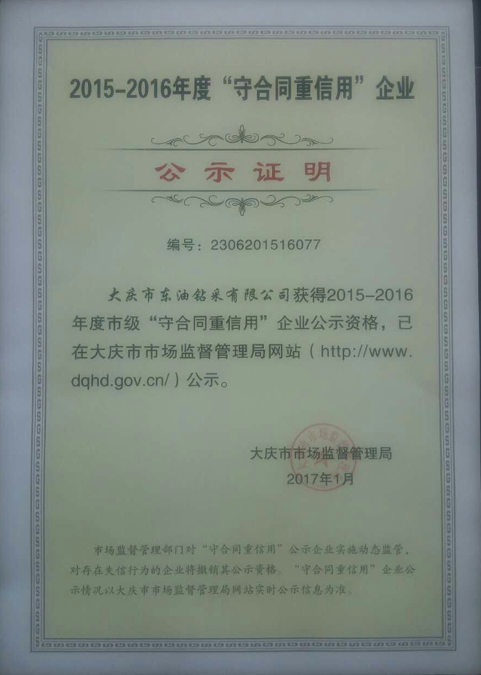 大慶市東油鉆采有限公:2015-2016年度市級(jí)“守合同重信用”企業(yè)公示證明